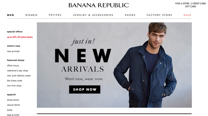 Or if you simply must have a secondary navigation, make sure it’s consistent on every page of your site like Banana Republic does.